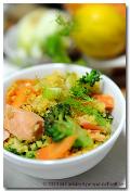 Gör så här:Koka potatisen i lättsaltat vatten och låt den svalna. Skär i stora bitar. Skiva korven tunt, ge den lite stekyta i pannan och lägg åt sidan för att svalna. Skär eller klipp bacon i mindre bitar. Knaperstek i stekpanna och låt rinna av på hushållspapper. Skölj och rensa salladen och lägg den i botten av ett stort serveringsfat. Finhacka lök och klipp gräslök. Dela tomaterna i fyra delar. Blanda potatisen med vinäger, citronsaft, kapris, lök och gräslök. Skär brieosten i bitar och blanda ner den i salladen. Blanda försiktigt ner baconet. Lägg upp på serveringsfatet, dekorera med tomaterna, ringla över oljan och servera salladen ljummen eller kall.