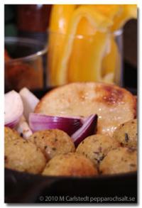 Gör så här:Hacka eller mixa löken och vitlöken tillsammans med solroskärnorna. Smeten ska få en grov konsistens så mixa inte för slät. Blanda ner ströbröd och grädde eller mjölk. Tillsätt ägg, salt, peppar och ost och blanda till en jämn smet. Låt gärna smeten stå och svälla en stund innan den formas till små bollar. Är smeten för fast kan lite mera vätska tillsättas. Och är den för lös, blanda ner mera ströbröd. Koka upp vatten i en stor kastrull, tillsätt salt och sjud bollarna några minuter så de håller ihop väl. Ta upp, gärna med hålslev och låt rinna av. Stek bollarna tills de får fin färg i olja eller smör. Varmhåll och servera tillsammans med potatis eller ris. ![]() Kommentar av